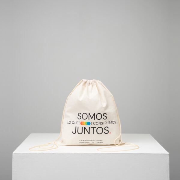 Es una bolsa práctica estilo tula con cordón para cerrar y cargar a la espalda, los que la convierte en una bolsa muy segura y práctica. Puede elaborarse según las necesidades y gusto de los clientes en algodón crudo biodegradable, poliéster semipermeable, yute tipo costal y dril. Resulta un producto perfecto para eventos, congresos y regalos corporativos.